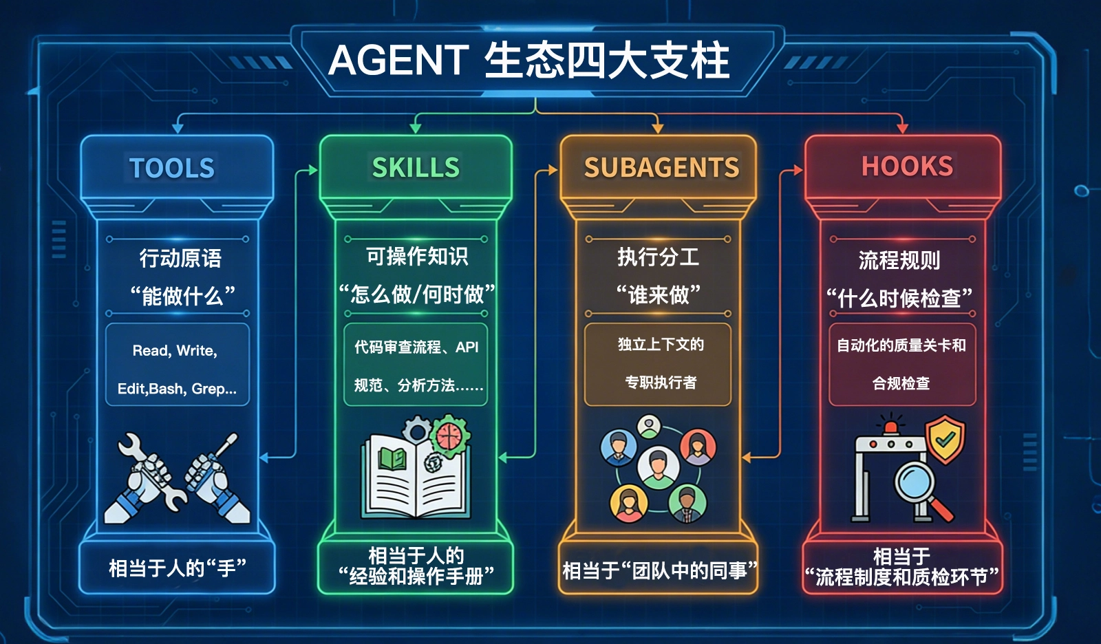 Hooks 是流程规则。它回答的是什么时候检查。它们在关键节点自动触发质量校验或合规约束,类似企业中的质检流程。