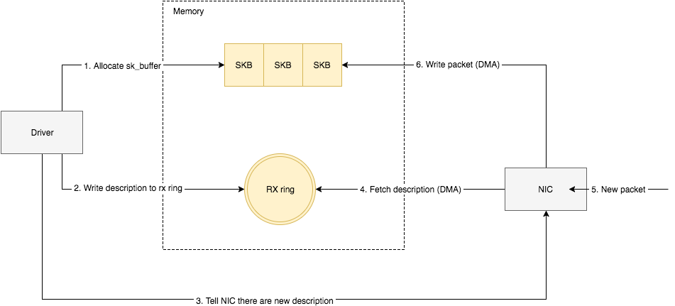 - 网卡将新数据包通过 DMA 直接写到 sk_buffer 中。