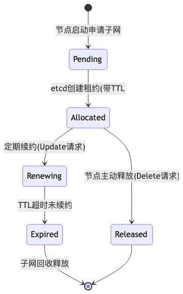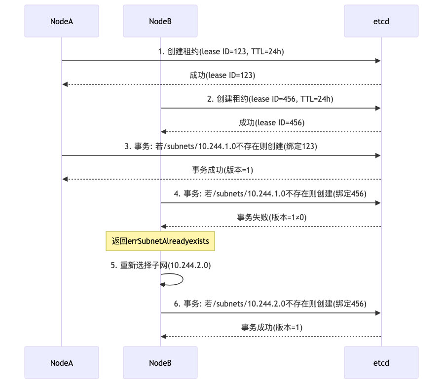 - 正常路径(NodeA):租约创建→事务成功→获得子网
